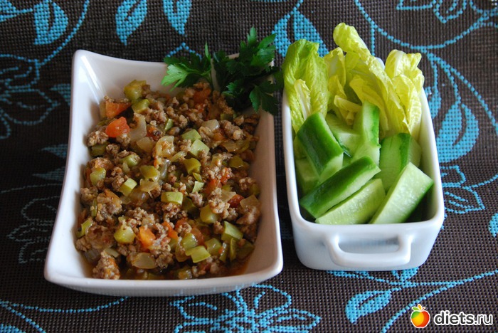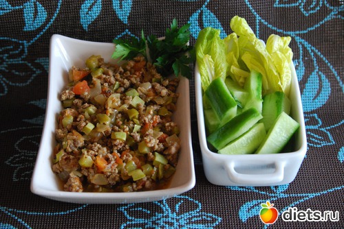 Обед: Фарш тушеный с овощами, огурец