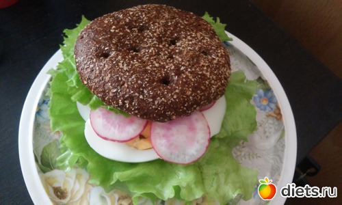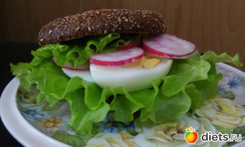 О - сендвич с яйцом, редисом и салатными листьями (фото потом выложу), салат из яиц, редиса и салатных листьев, баклажанная икра