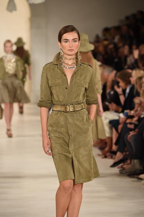 Вот такого плана платья нормально будут. Не смотрите, что на картинке худая, большего размера отлично сядут - сафари, платья-рубашки, спорт-стиль, всё такое. Только длину обязательно до колена или ниже. Я потом еще других примеров накидаю. Ну и всякие цацки - серьги, бусы, цепи тоже по-брутальнее