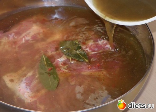 Если вы хотите, чтобы мясо получилось мягким и таяло во рту, приготовьте для него маринад из рассола. Нарежьте мясо кусками средней толщины. Залейте рассолом и добавьте специи по вкусу. Оставьте на пару часов. Затем достаньте мясо, по вкусу посолите и поперчите, полейте оливковым маслом. После отправьте блюдо в разогретую до 200 градусов духовку. Запекайте до готовности.
