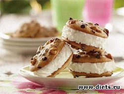 Формируем шарик мороженого, который кладем на одно печенье, осторожно накрывая его вторым и немного сжимая. У нас получается пирожное с начинкой из мороженого, которое можно подавать сразу же на стол, или, завернув в полиэтиленовую пленку, поставить в морозильник. Там без изменений вкусовых качество оно может храниться от одной до двух недель.