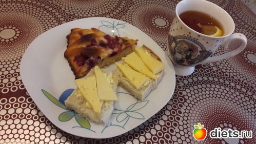 Завтрак - 2 бутерброда с маслом и сыром, кусочек кекса с вишней + чай