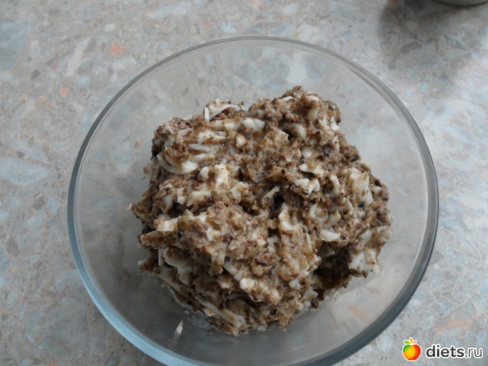 На крупной тёрке натёрла сырок (на полчасика в морозилку - чтобы лучше тёрся), и перемешала с грибной массой