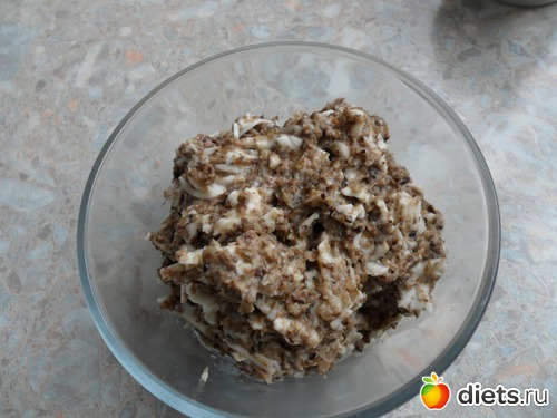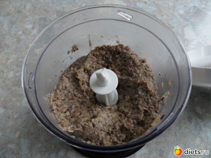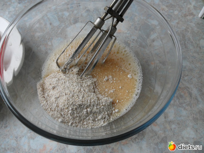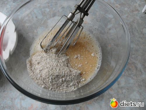 Перемешать, всыпать овсяную муку, до консистенции массы как на оладьи