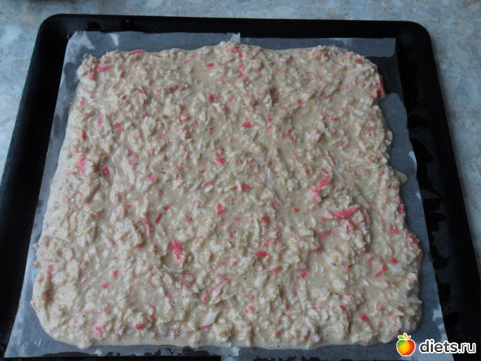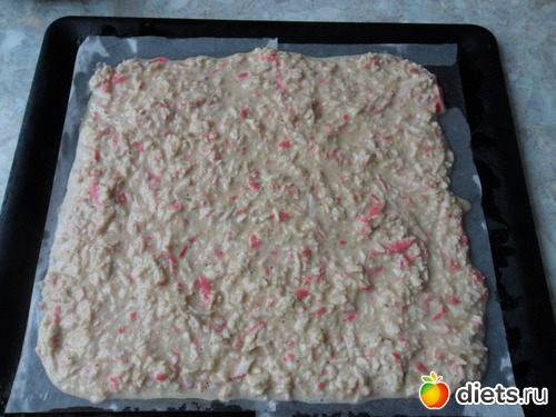 Противень застилаем пергаментом (пекарской бумагой), смазываем растительным маслом, и распределяем массу.