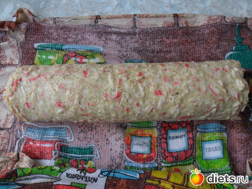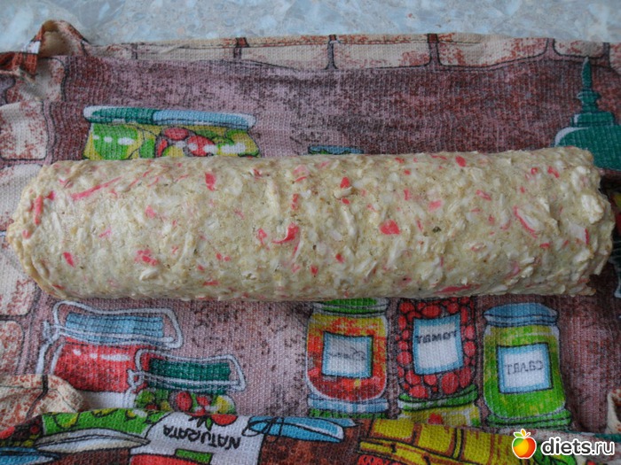 Минут через десять разворачиваем, выкладываем начинку, и заворачиваем в рулет.