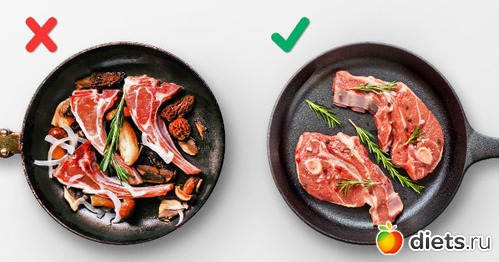 Хрустящая корочка на мясе может не получаться ещё и из-за того, что вы используете для жарки сковороду с антипригарным покрытием. Такая посуда нагревается слабее, чем обычная, поэтому её лучше оставить для омлетов, блинчиков и оладий. Для мяса же используйте сковороду-гриль или чугунную сковороду.