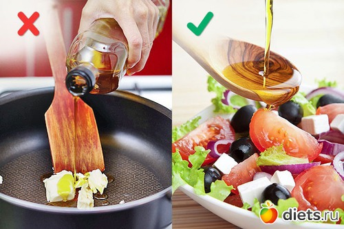 При сильном нагреве оливковое масло теряет все свои полезные свойства и начинает гореть, что может полностью испортить вкус ваших блюд. Поэтому оставьте оливковое масло для заправки салатов, а для жарки используйте рафинированное подсолнечное.