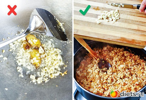 В рецептах многих блюд не зря говорится, что чеснок нужно добавлять в конце приготовления или же выложить на сковороду на 2–3 минуты, а потом убрать. Из-за того, что в чесноке содержится гораздо меньше воды, чем в других овощах, он очень быстро подгорает и может придать блюдам неприятный едкий привкус.