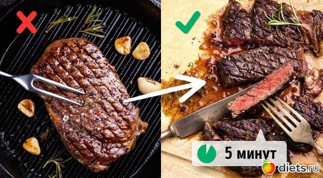 Даже если вам обычно не терпится попробовать готовое блюдо, в случае с мясом лучше подождать пару-тройку минут, прежде чем его резать. Так все соки распределятся более равномерно, а вкус станет насыщеннее.