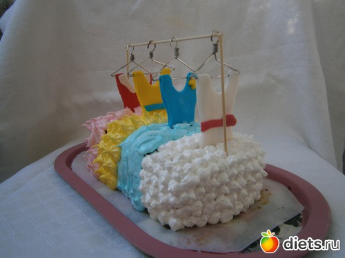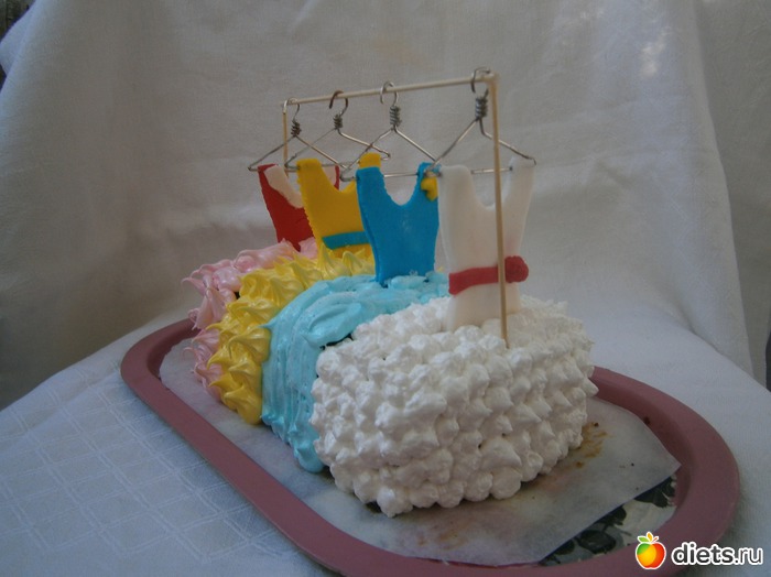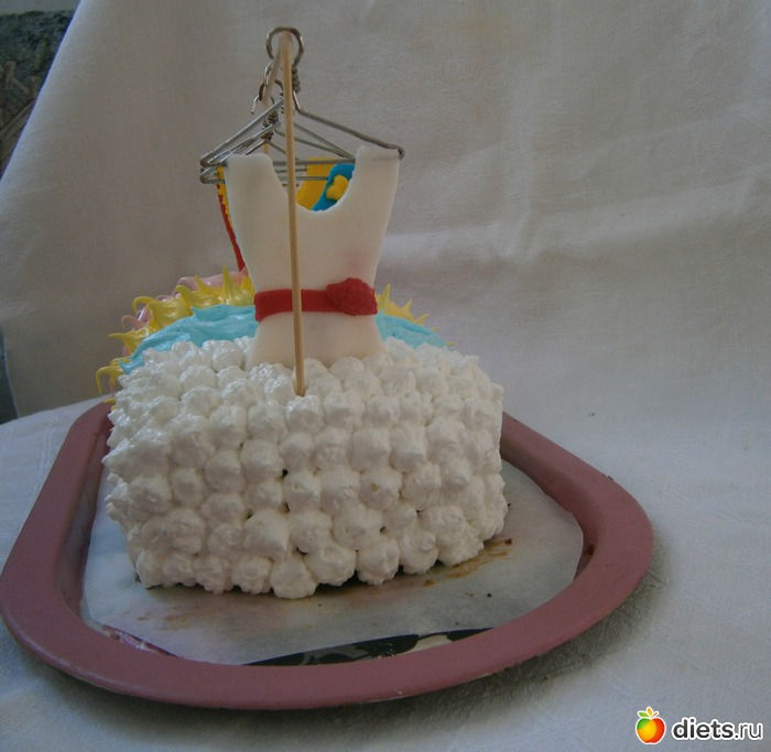 В основе шоколадный бисквит, крем шоколадный, верх платьев из мастики, низ - белковый крем.