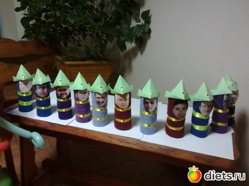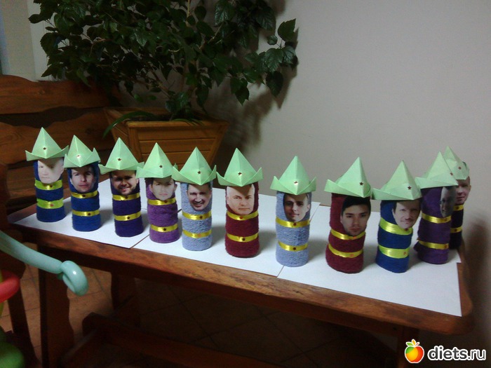 Подарить решили им полотенца. Их просто скрутили, сделали шапочки из бумаги и наклеили их фотки-мордочки.
