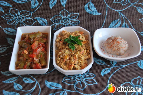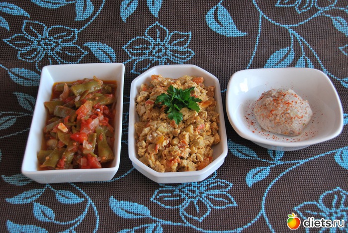 Обед: Тушёная стручковая фасолька, утренний омлет и котлета рыбная