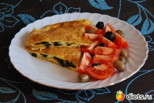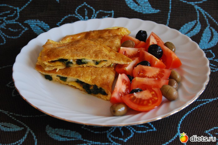 Сегодня на завтрак: Омлет со шпинатом, помидор, оливки.