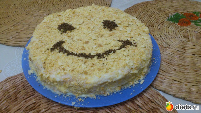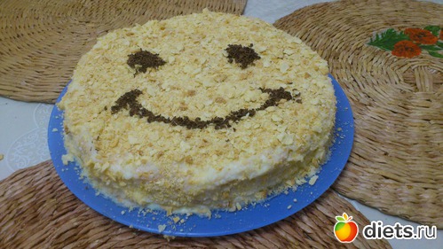 После того как заварной крем остыл смешиваем его с масляным кремом и от души промазываем коржи, обрезками посыпаем верх.