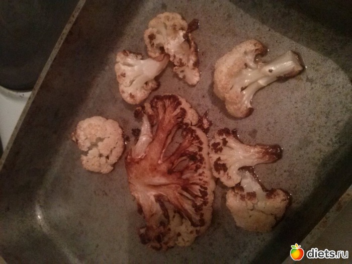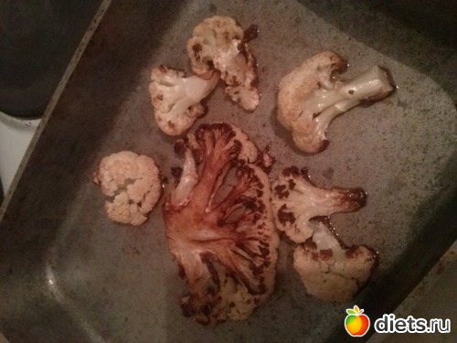 надо разрезать цветную капусту на ломтики( не маленькие) обжарить их с двух сторон на масле, а потом поставить в духовку до готовности на 12-15 минут