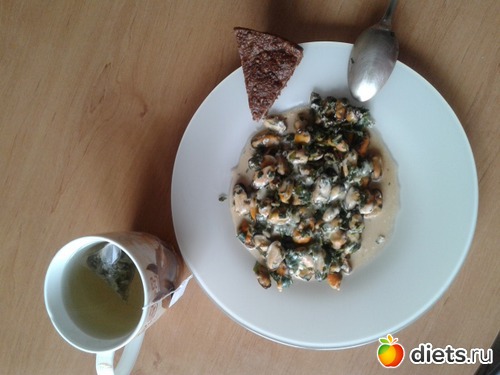 Сегодняшний обед. Мясо мидий с петрушкой, чесноком, ложкой йогурта и соевым соусом. Хлеб Дю. Чай молочный улун.