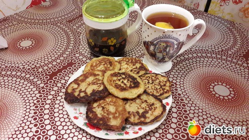 Завтрак - морковно-овсяные оладушки с вишневым вареньем + чай