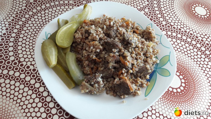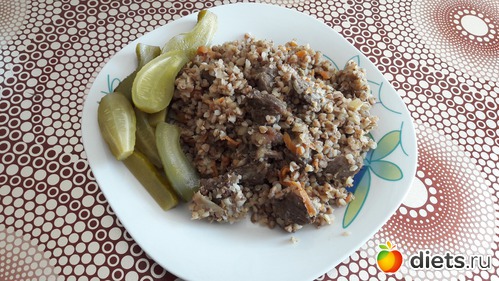 Обед - плов из гречки + маринованные огурчики