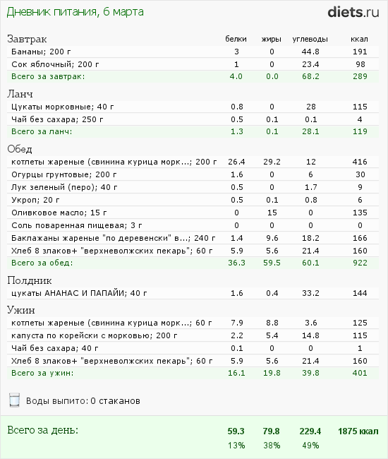 Мало клетчатки, банан лучше заменить на твердое яблоко, сок на зел. чай или компотик, цукаты (они с сахаром варятся) на чернослив, если хочется послаще - финики (1-2 с чаем), т.к. фруктоза, а не сахароза, к тому же в цукатах нет витаминов, одни калории. Котлетки не жарить, а запекать в духовке вместе с баклажанами. И салат!!! обязательно на гарнир салат (на основе капусты), он даст сытость без калорий. Если так чуть скорректироваться, результат обязательно будет