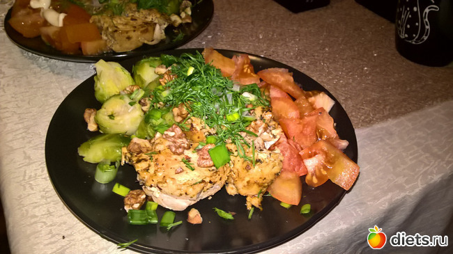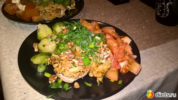 На тарелку выкладывается готовое филе, брюссельская капуста, томат, посыпается орехами, зеленью. Можно сбрызнуть лимонным соком. Салат вкуснее, пока теплый.
