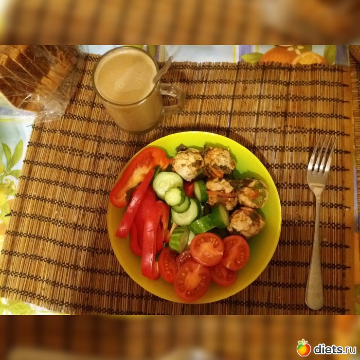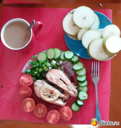 форелька, огурец-помидор-зелень, 2 хлебца+груша, кофесливки