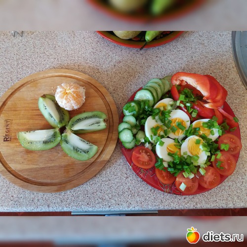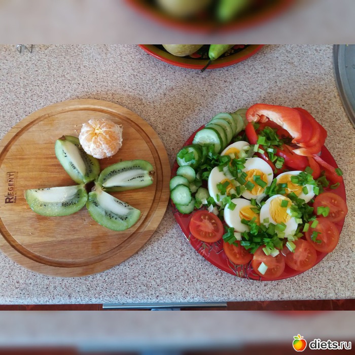 3 яйца, болгарыч-помидор-огурец-зелень, киви, мандарин