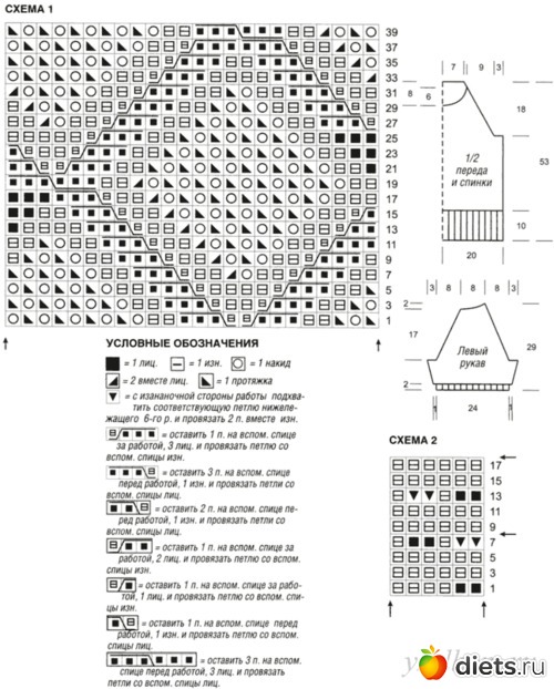 Спинка. На спицы №3 пряжей ODE итальянским набором набрать 109 п. и вязать резинкой 2х2. Через 10 см (=40 р.) вязать спицами №3,5 ажурный узор. Через 35 см (=140 р.) от начала вязания закрыть для регланных скосов с двух сторон 1х9 п., затем попеременно в каждом 2-м и 4-м ряду 27х1 п. Через 53 см (=220 р.) от начала вязания закрыть оставшиеся 37 п.