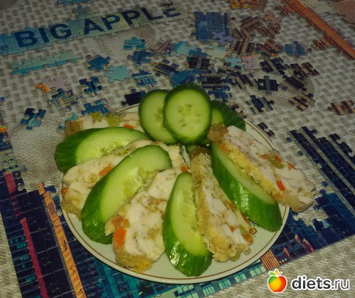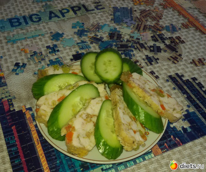 филе куриное нарезать, добавить чеснок, соль, приправы любимые, желатин. Всё в пакет, в форму и в духовку. Затем остывшее в холодильник. Я вчера вечером делала, сегодня ела.
