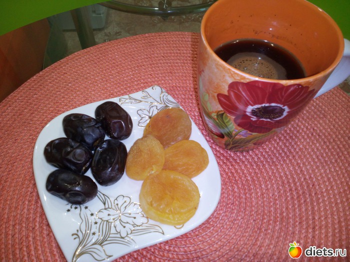 Завтрак: сухофрукты наивкуснейше любимейшие - неглазированные финики и курага с кофе.