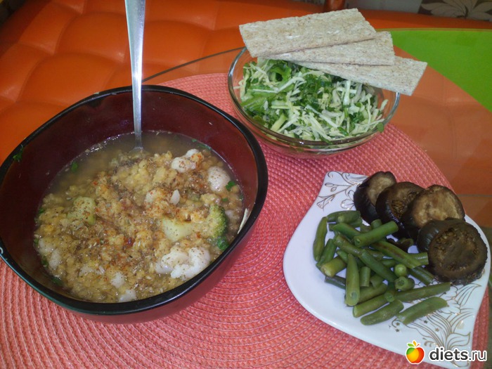 Обед: супчик с красной чечевицей, броколли и цветной капустой. Отдельно на сухой сковородке пропустила баклажаны и стручковую фасоль. Свежий салатик с оливковым маслом. В дополнение хлебцы с клетчаткой.
