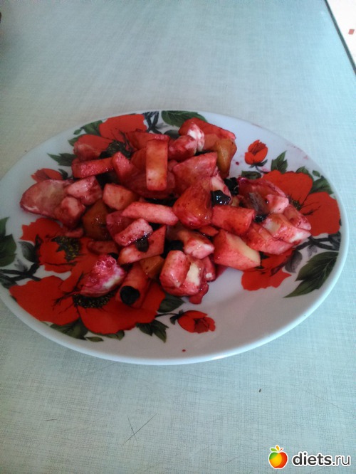 Полдник : фруктовый салат : банан, яблоко, апельсин, киви порезала и заправила размороженной черникой.
