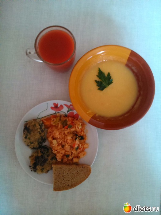 Обед: 1) постный гороховый суп: горох замочила, сельдерей нарезала кубиками, поварила 1,5 часа, добавила морковь на терке, чеснок, еще поварила минут 15, потом все взбила погружным блендером.