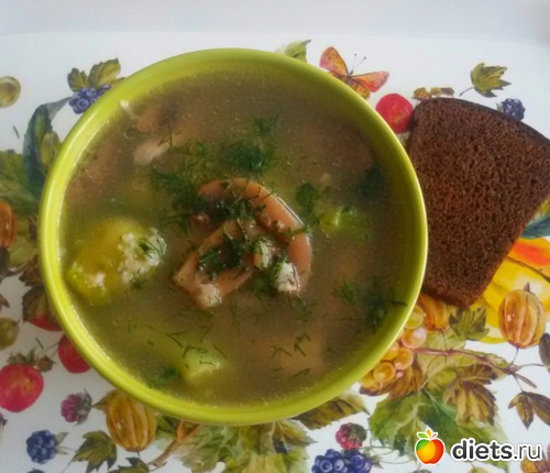 , очень вкусный вышел (мясо куриное, брокколи, брюссельская капуста, шампиньоны, хлопья перловые), хлеб.
