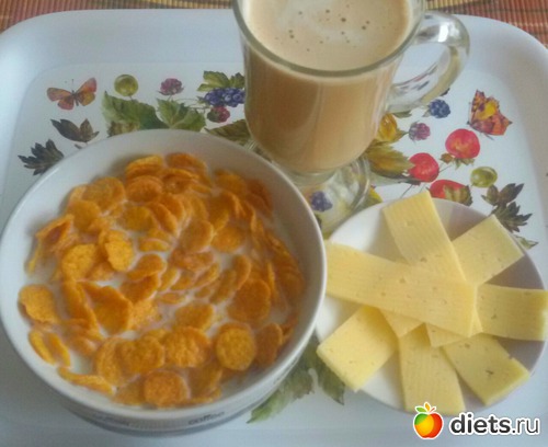 Хлопья мультизерновые, молоко, сыр, капучино.