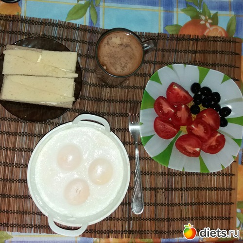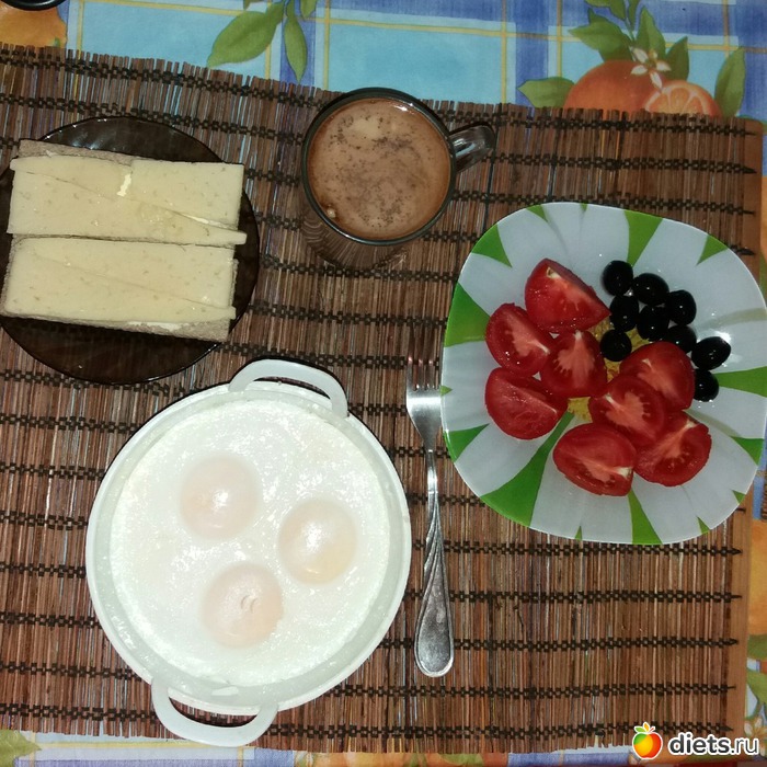 Яичница из пароварки, маслинки, 2 помидорка, хлебцы с маслом и сыром, кофесливки
