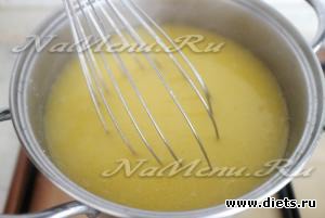 Всыпаем мелким дождиком кукурузную муку в кипящую воду, быстро размешивая воду венчиком. Теперь осталось лишь уварить поленту до загустения, часто помешивая. Время варки смотрите на упаковке, есть кукурузная мука, которая готовится моментально, а есть та, которой нужно 40 минут.