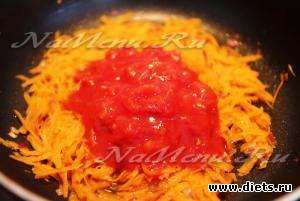 Разогреваем оливковое масло на сковороде. Поджарим на нем мелко нашинкованный лук до прозрачности. Затем добавим натертую на терке морковь. Когда она станет мягкой, добавим томаты, нарезанные кубиками (кожицу лучше снять, но не обязательно)