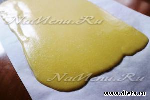 Сворачиваем рулет, начиная загибать от ближнего к нам края. Чем плотнее свернете рулет, тем легче его будет резать.