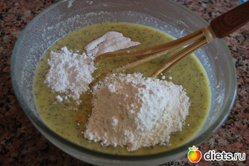 Яйца взбить с сахаром,затем добавить всё остальное и перемешать чтоб не было комочков.