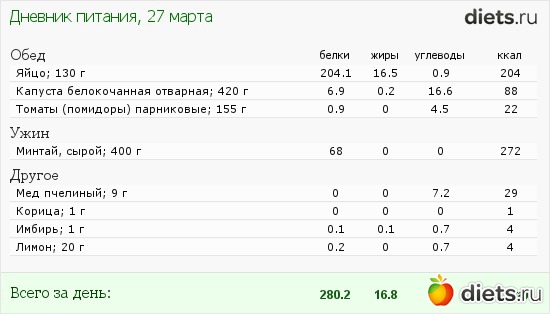 Не знаю только будет ли нарушением моя утреняя водичка (она с медом, лимоном, чуть корицы и имбиря) Утренний кофе я пропустила так как пришлось лететь по делам. На обед тушеная на воде капустка с яйцом (спасибо лайфахам), помидорку измельчила на блендере. На ужин минтай приготовленный в мультиварке на пару (правда в воду добавила 1 лавровый листик) Вес мой на начале 95,7
