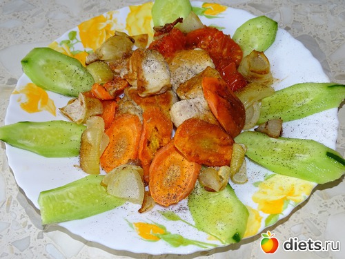 - Пожарила на сковороде-гриль без масла морковку, лук, помидор и куриную грудку, а потом поставила в духовку допекаться