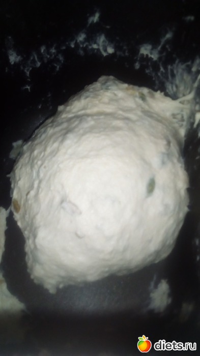 Всегда предупреждаю:мука разных производителей, разного помола, разной влажности! Из-за этого может понадобится чуть больше-меньше-воды-муки. Следите за состоянием"колобка" из теста. Фотографию колобка я уже несколько раз показывала в предыдущих постах, покажу и сейчас! Строго соблюдайте порядок закладки продуктов в вашу хлебопечку!(У меня порядок закладки начинается с жидкостей!)