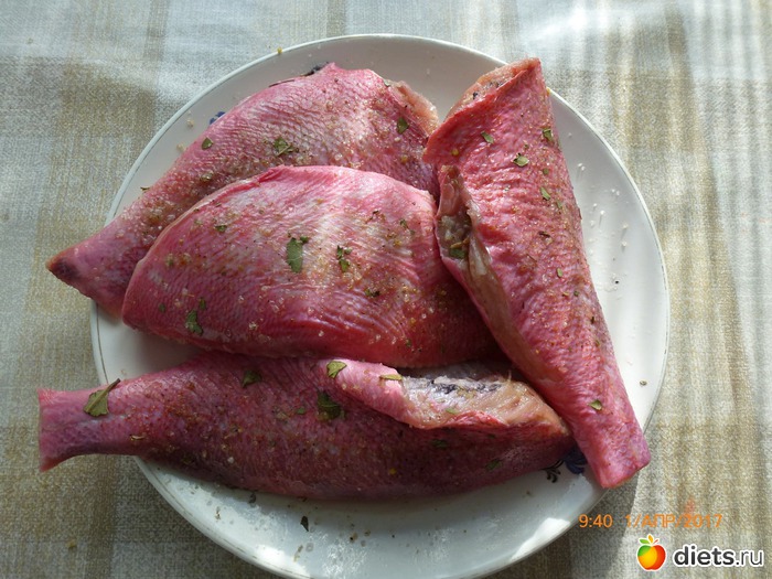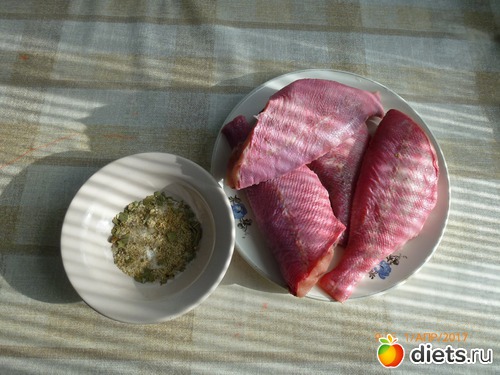 Окуня почистили момыли, промакнули салфеткой, приготовили смесь приправ -у меня грузинская соль и листик лаврушки мелко разломаный