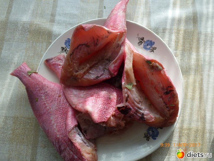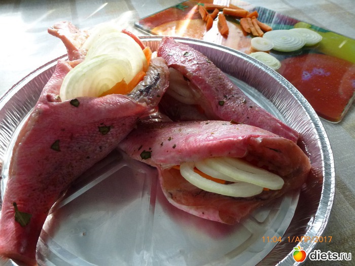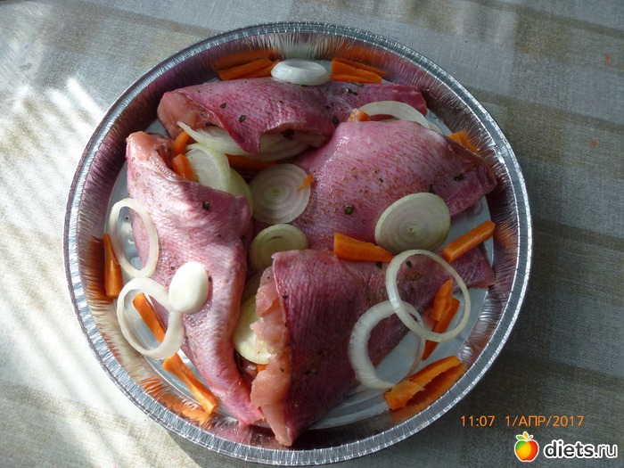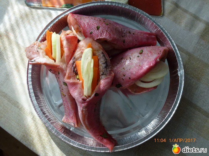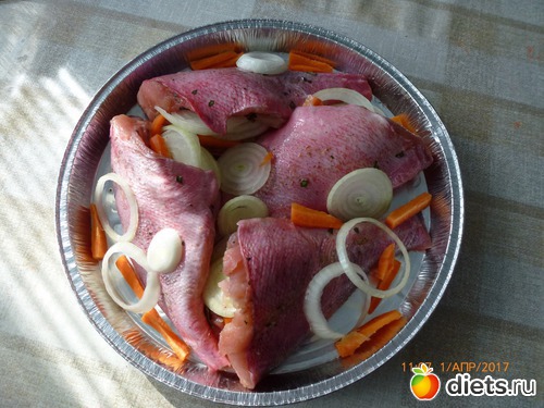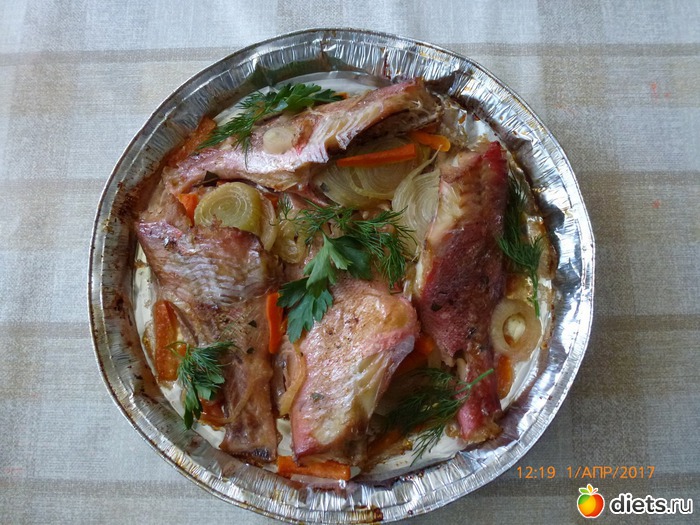 И в духовку при 180градусах минут на 35-40, затем сняли фольгу и ещё минут на 10. У меня сильно не прижарился окунь, но вот так получилось в итоге: