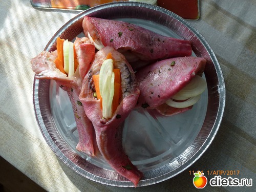 Далее промакнули рыбу салфеткой и в каждое брюшко положили кружки лука и брусочки моркови
