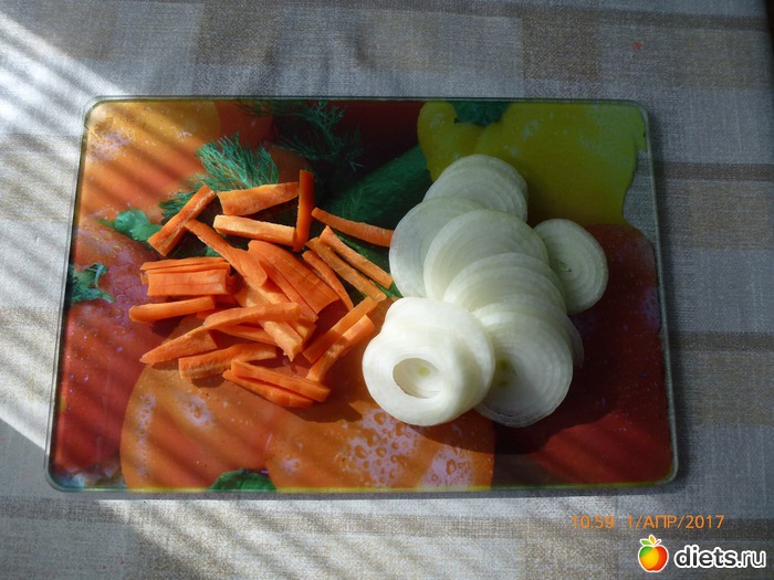 А пока нарезаем кружочками луковицу и половинку моркови-брусочками