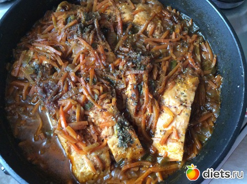 Лук очистить и нарезать полукольцами, чеснок нарезать пластинками. На оливковом масле обжарить лук и чеснок, поперчить и посолить. На дно формы для запекания кладём обжареный лук и чеснок. Филе рыбы нарезать на средние кусочки, посолить и поперчить и положить по верх лука с чесноком, посыпать зеленью и зеленым горошком. Смешать пассату с водой и полить рыбу с овощами. Разогреть духовку до 200 гр и запекать 30 минут. Подать с картофельным пюре, можно с отварным рисом.