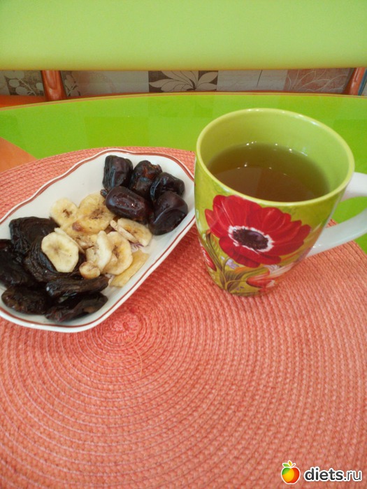 За день съела два яблока, сухофрукты и банановые чипсы (сладкие мне показались, наверное они их глазируют сахаром, это плохо конечно), полгрейпфрута.