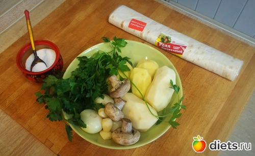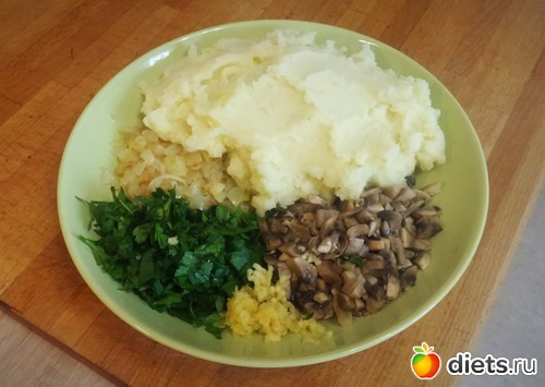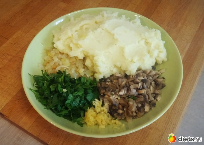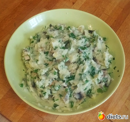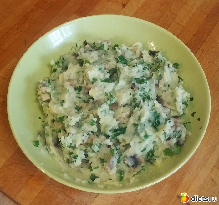 Картофель отварить в подсоленой воде. Пока варится картофель обжарить мелко рубленный лук в растительном масле до прозрачности. Грибы и зелень порубить мелко, чеснок пропустить через пресс. Слить отвар с готового картофеля оставив 50 мл. Пюрировать картофель добавив отвар. Смешать картофельное пюре с грибами. луком. чесноком и зеленью.